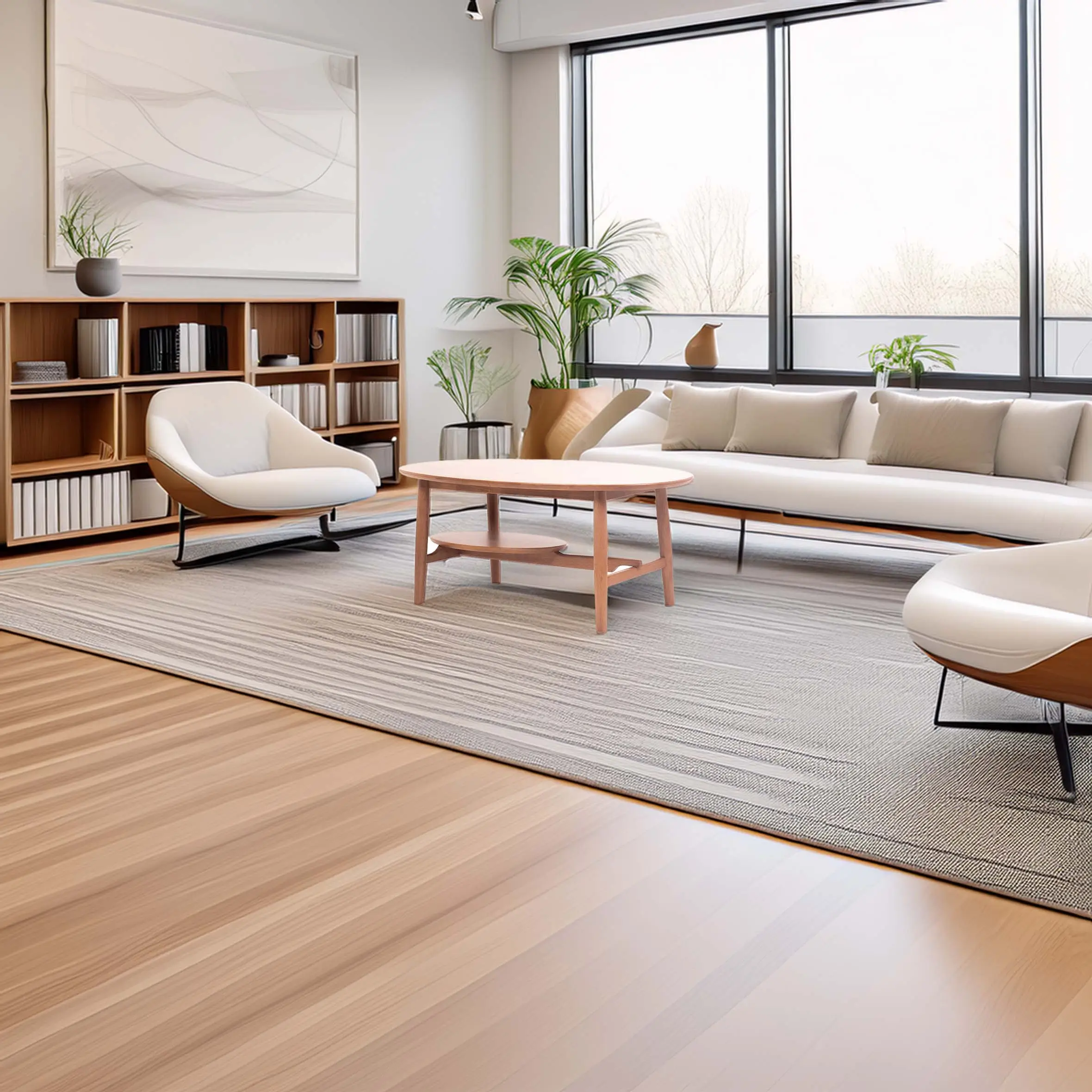Modern office space with a sleek wooden table centerpiece. Surrounding are white cushioned sofas, lush green plants, and large windows, creating an inviting and elegant ambiance.
