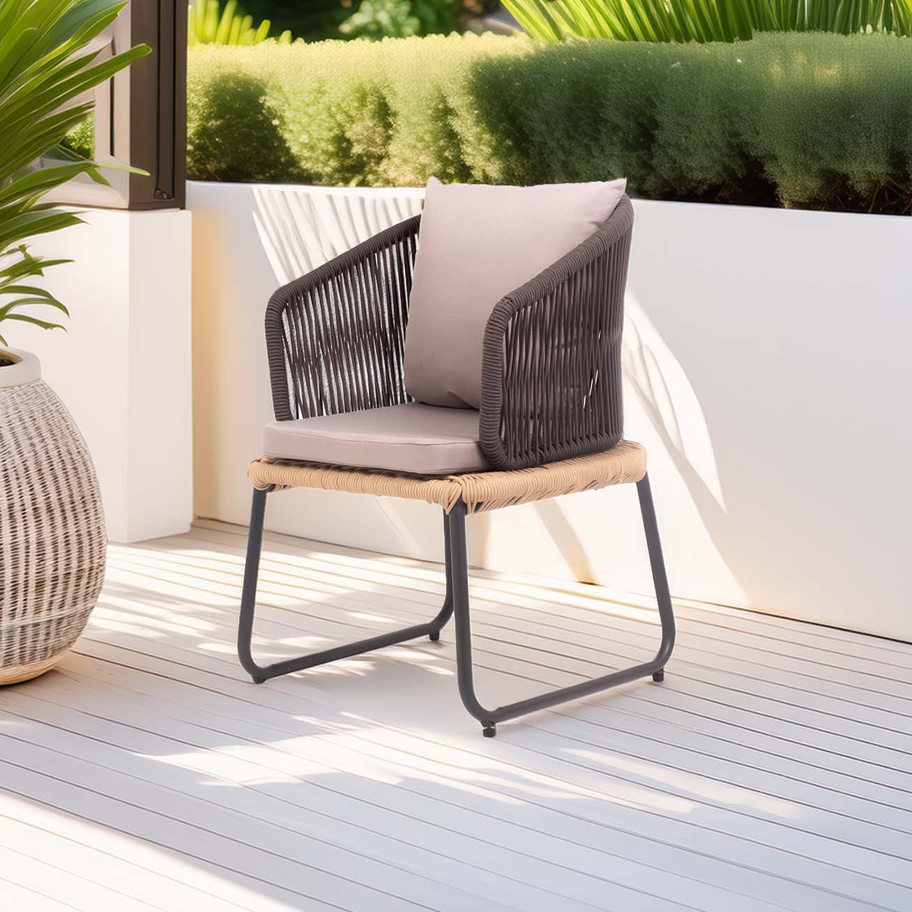 Outdoor patio with a wicker dining chair featuring gray cushions, beside a leafy potted plant against a white wall, creating a serene atmosphere.
