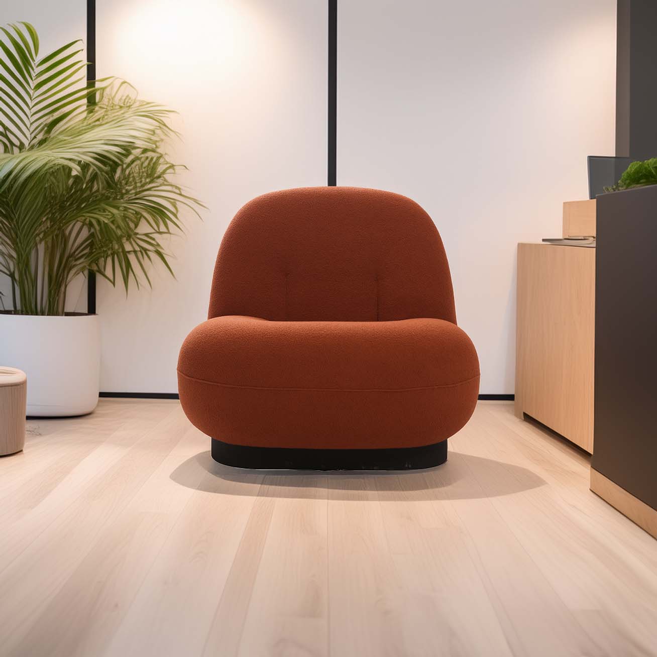 A cozy orange lounge chair against a dark background. A potted plant is nearby, adding a touch of greenery.