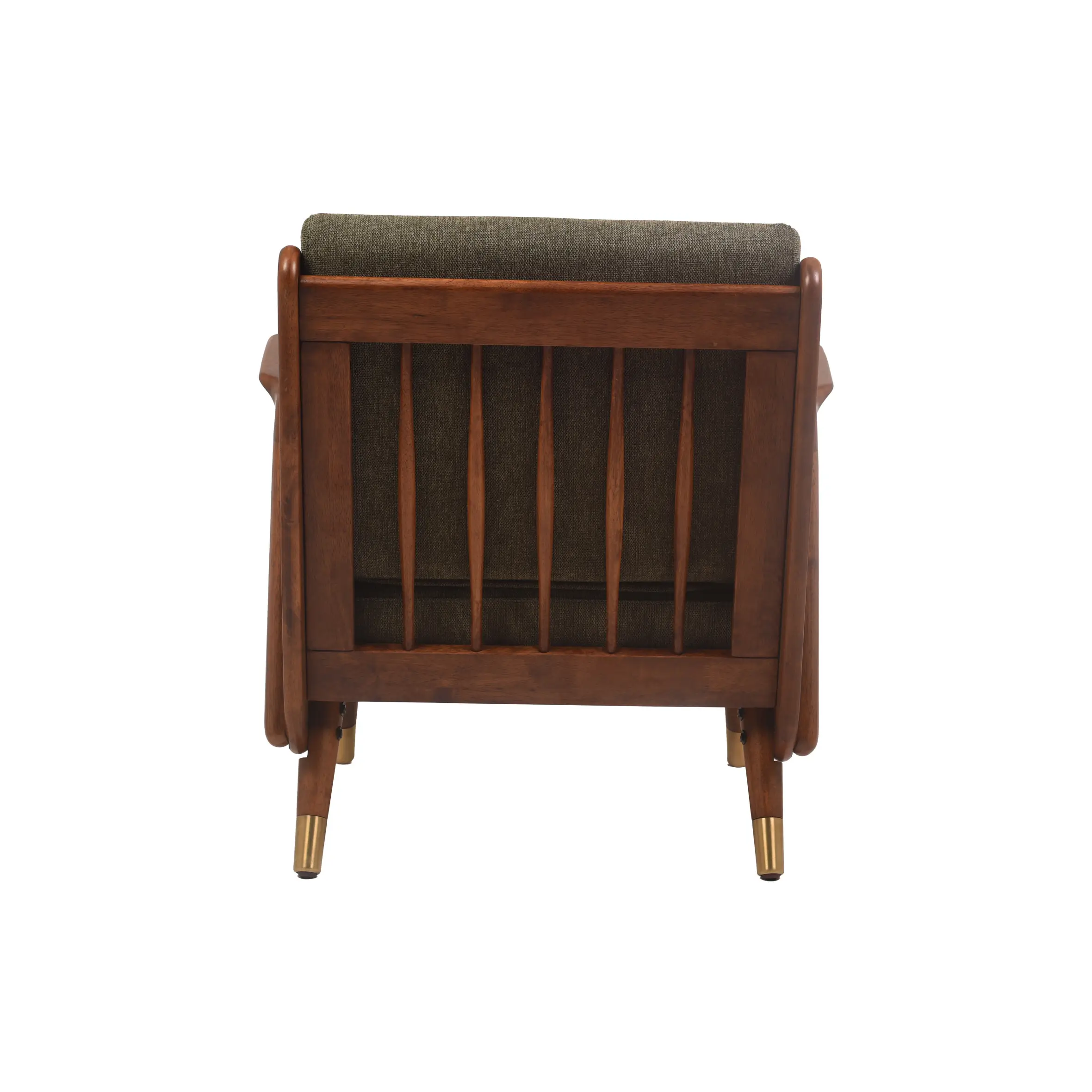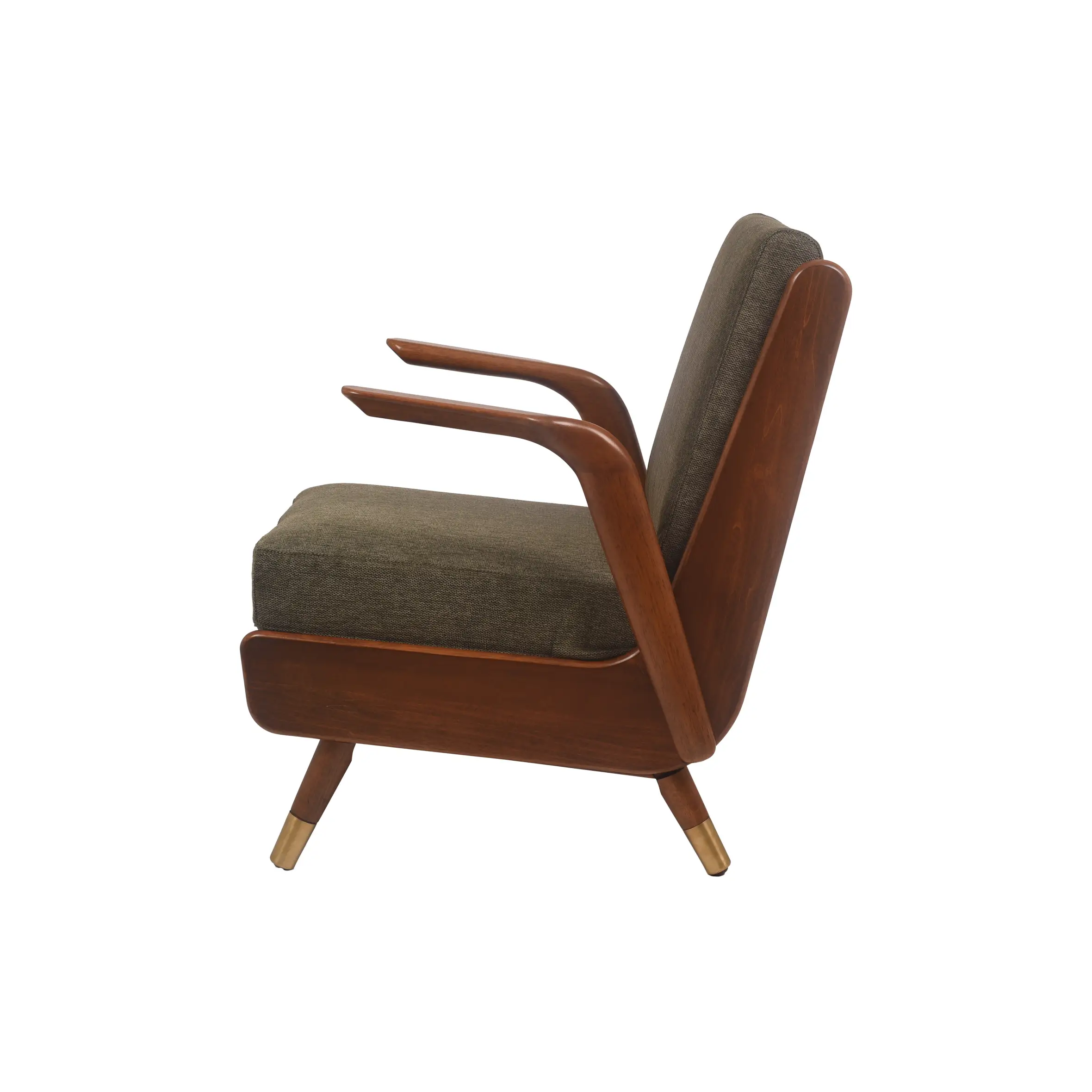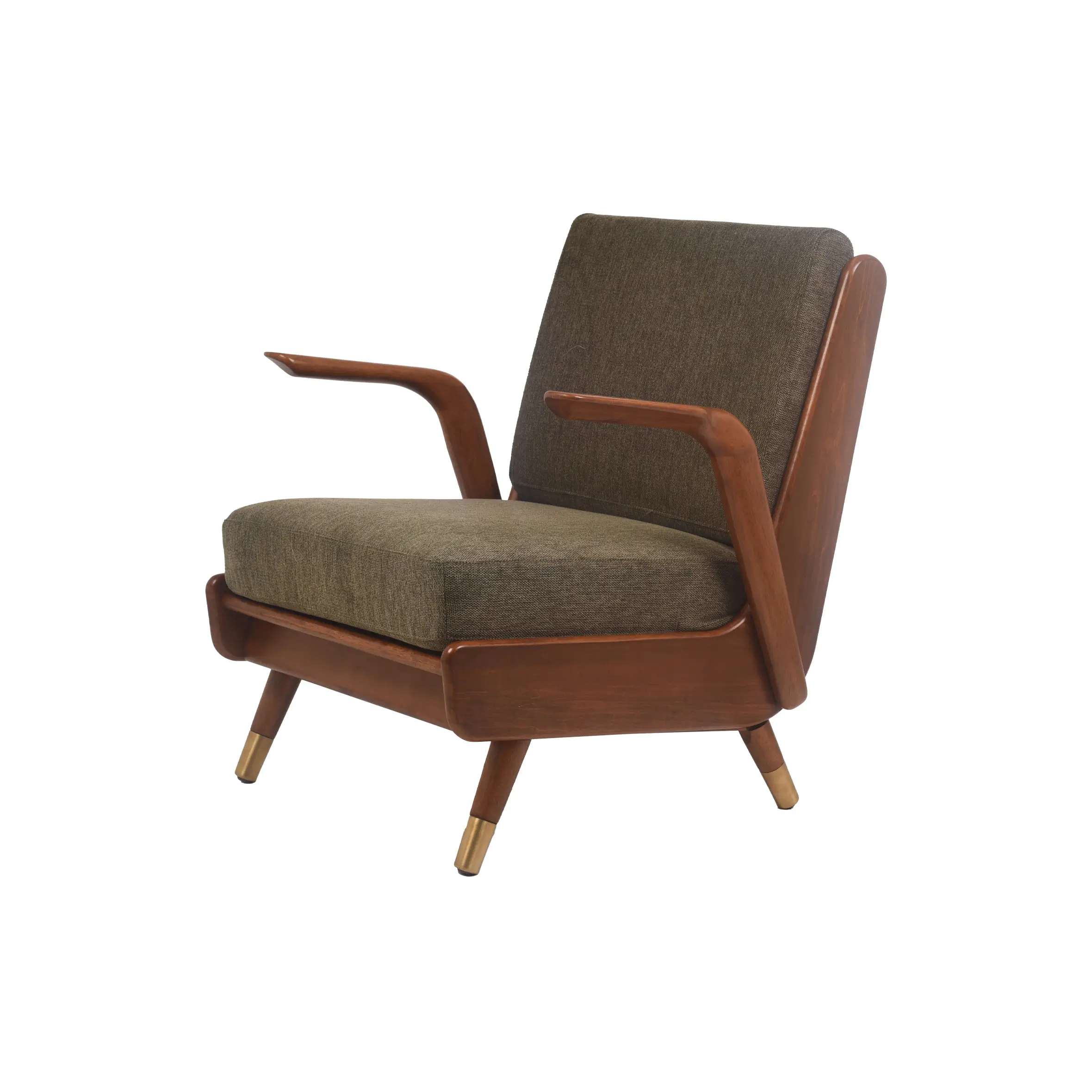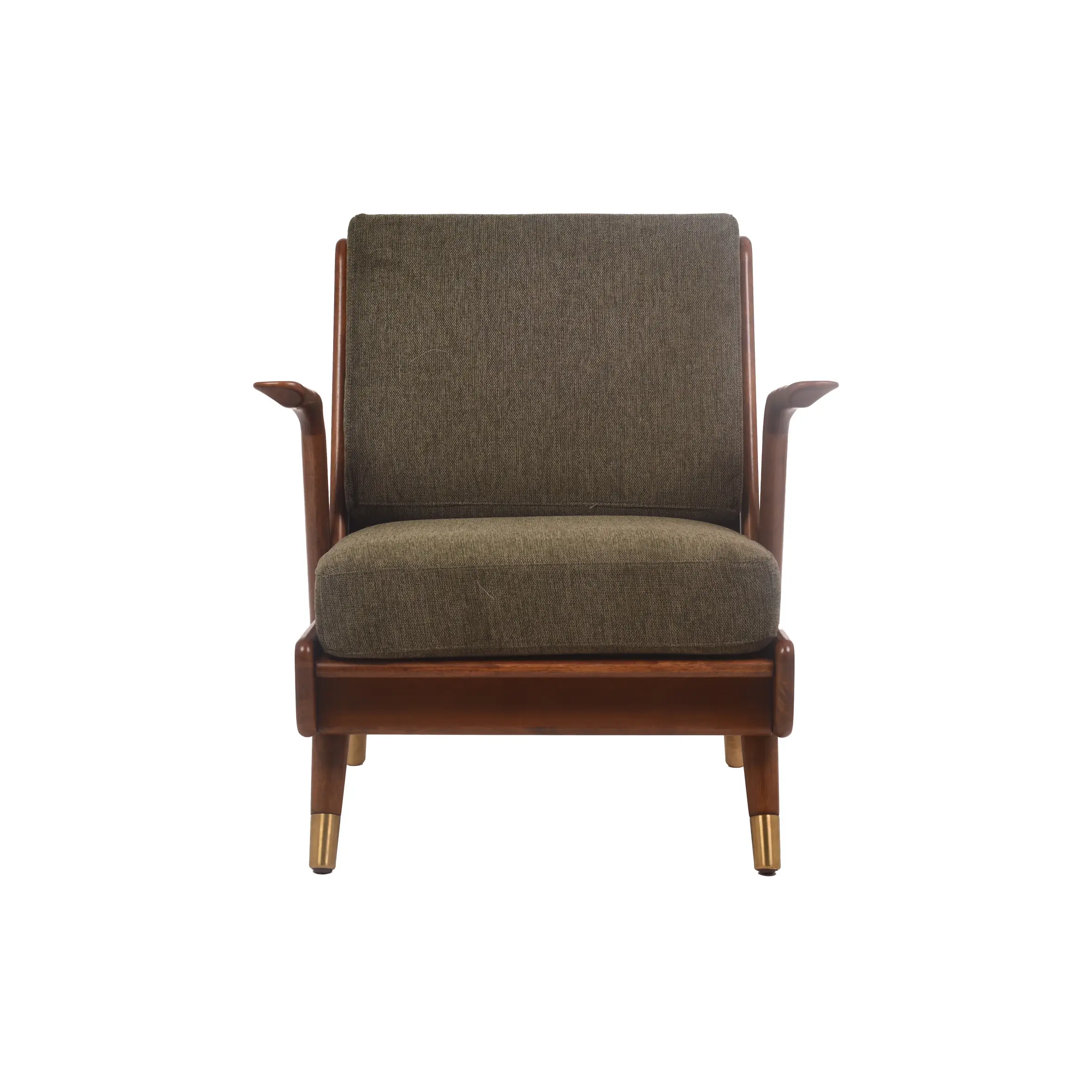 The Marlow Retro Sofa is a celebration of classic mid-century design. With its rich walnut-finished frame, elegantly curved armrests, and brass-tipped tapered legs, this chair exudes sophistication. The olive green cushions offer deep comfort with a bold vintage appeal, making it the perfect accent for living rooms, reading corners, or stylish studio lounges.