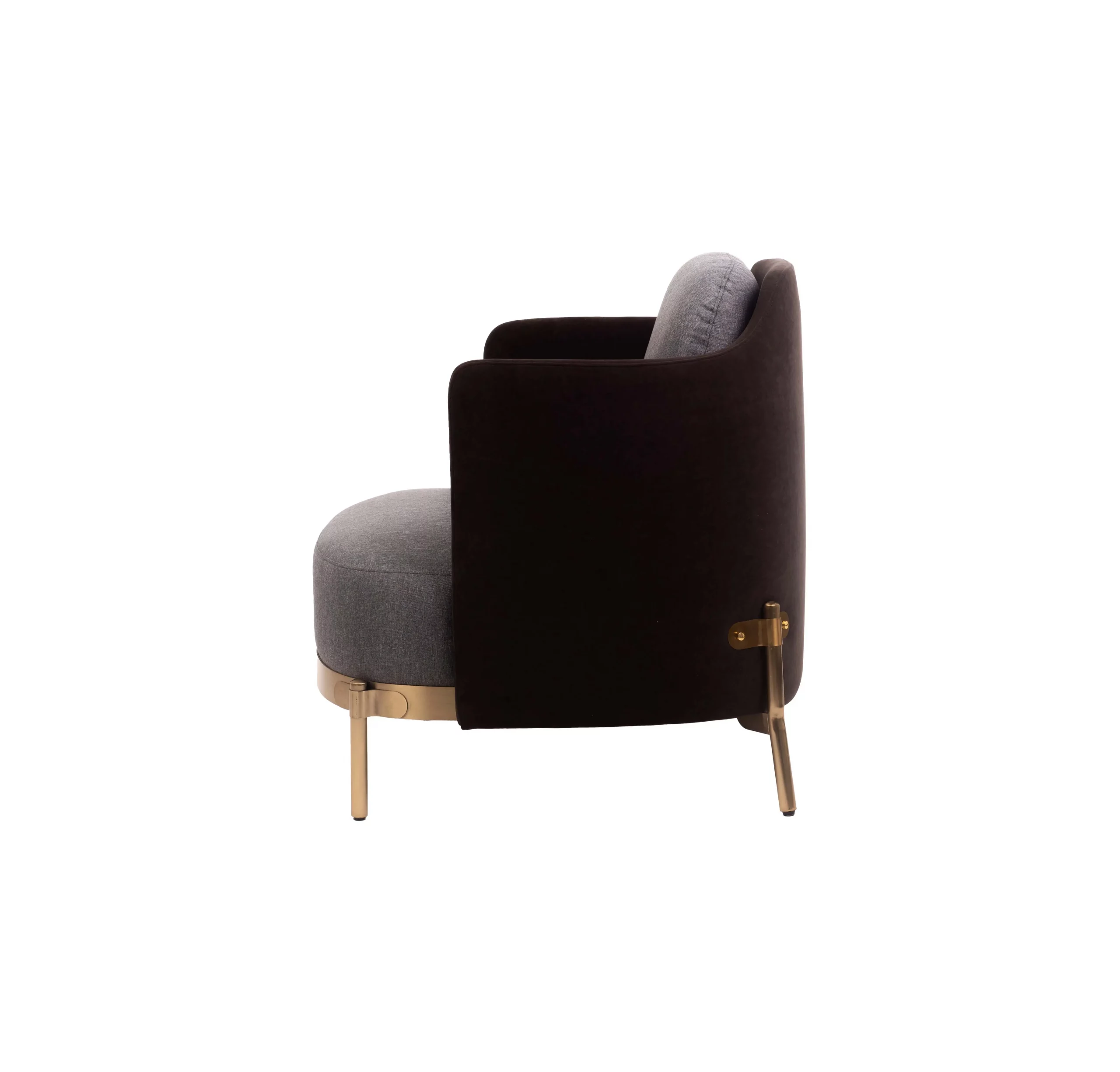 The Monroe Curve Accent Sofa delivers a perfect blend of contemporary elegance and luxurious comfort. Wrapped in dual-tone fabric, soft grey on the seat and back, and rich cocoa brown on the sides, this chair features a sweeping silhouette and a sculpted champagne gold metal base for added sophistication. Whether placed in a lounge, lobby, or modern living room, it brings instant polish and plush comfort to any setting.