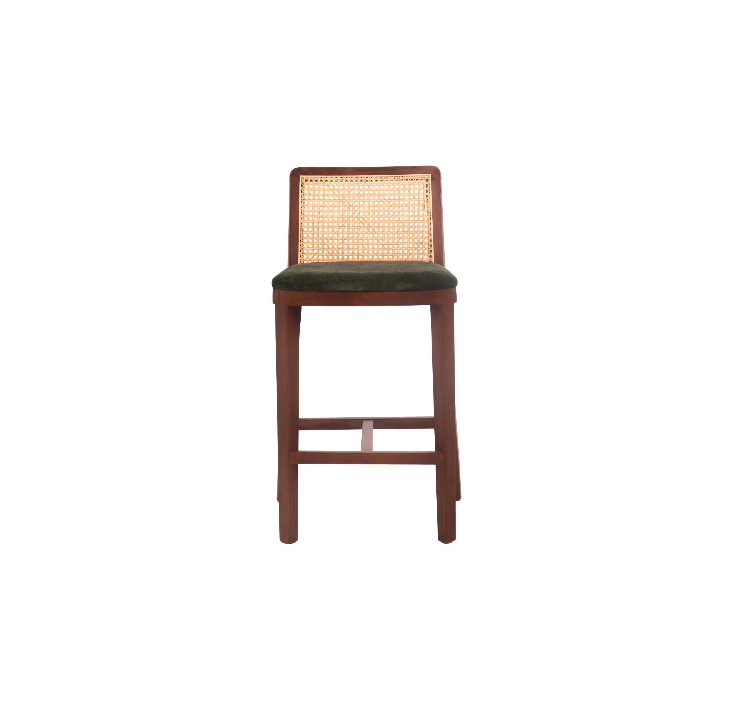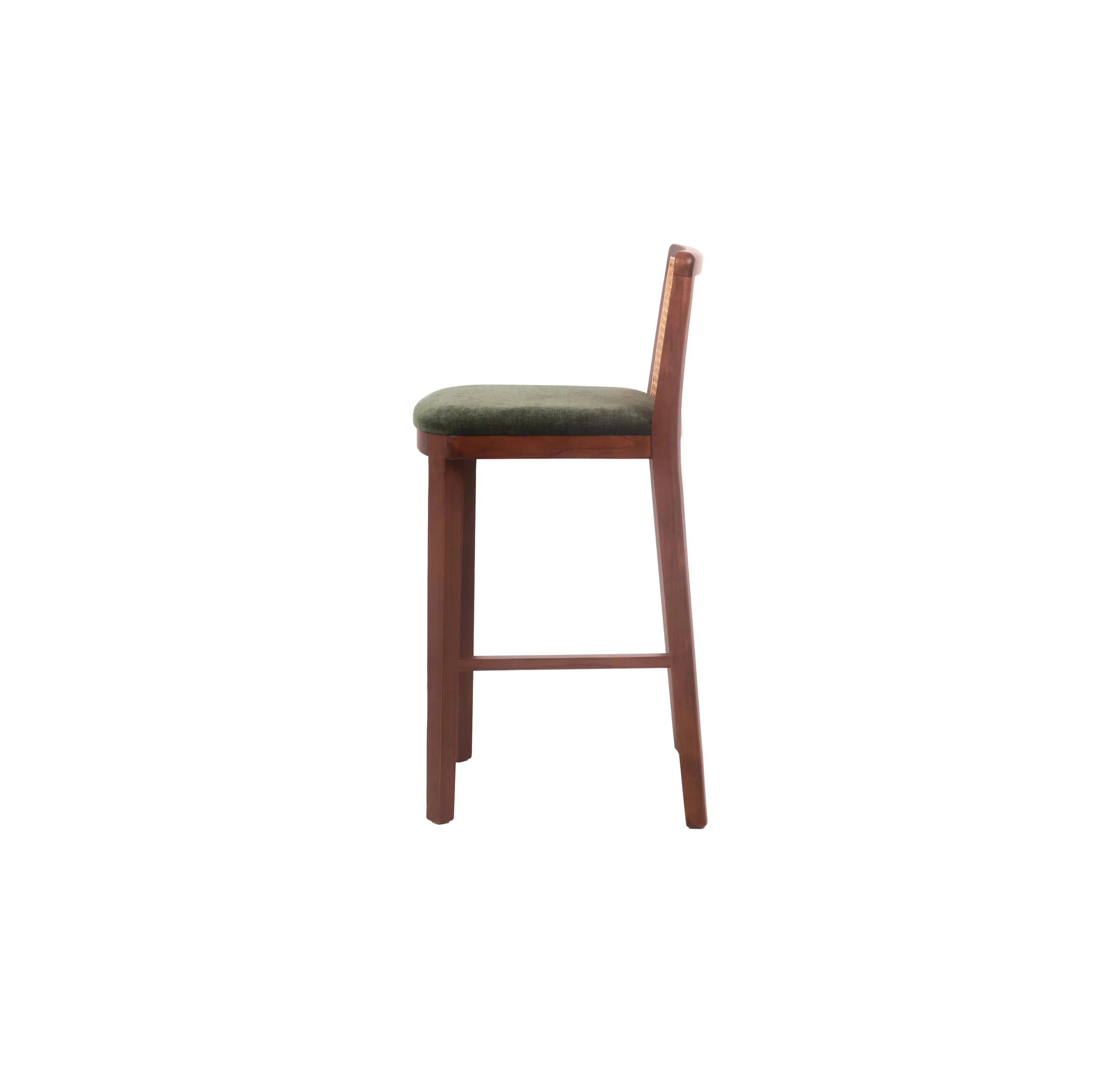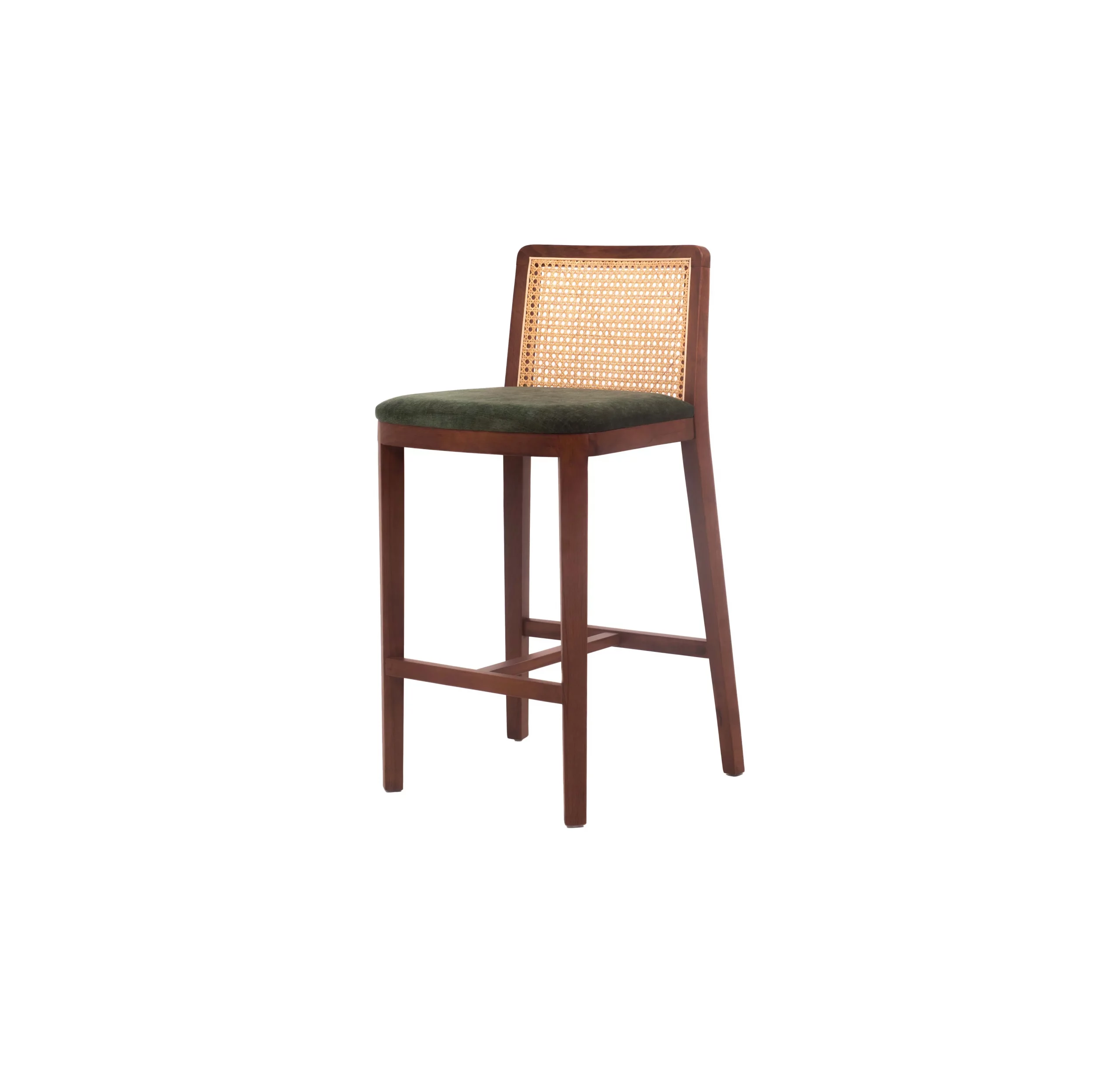 The Verda Mesh Bar Stool blends earthy sophistication with modern structure. Crafted from solid beech wood in a rich walnut finish, it features a breathable mesh backrest for added comfort and visual lightness. The plush, dark green upholstered seat provides a stylish contrast and cozy support, making it a perfect addition to kitchen counters, breakfast bars, or cafe-style dining setups.
